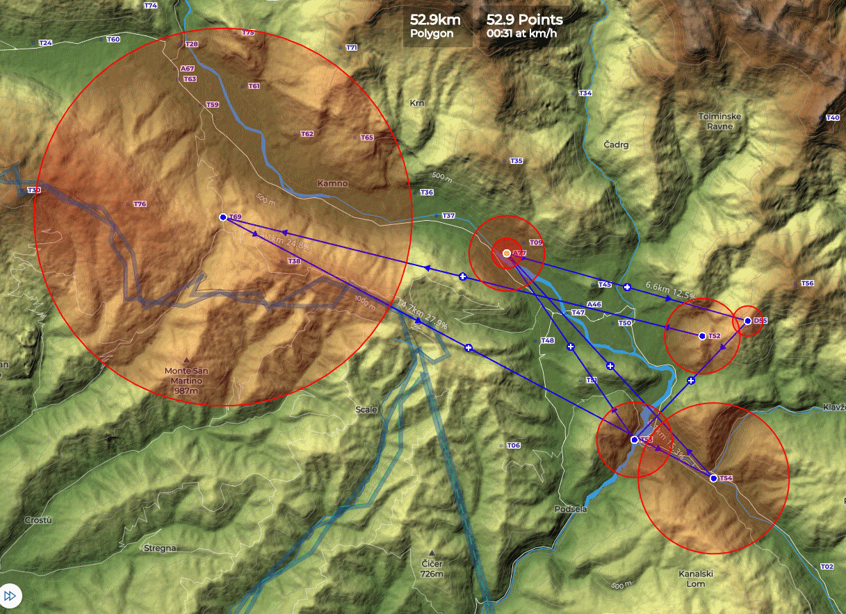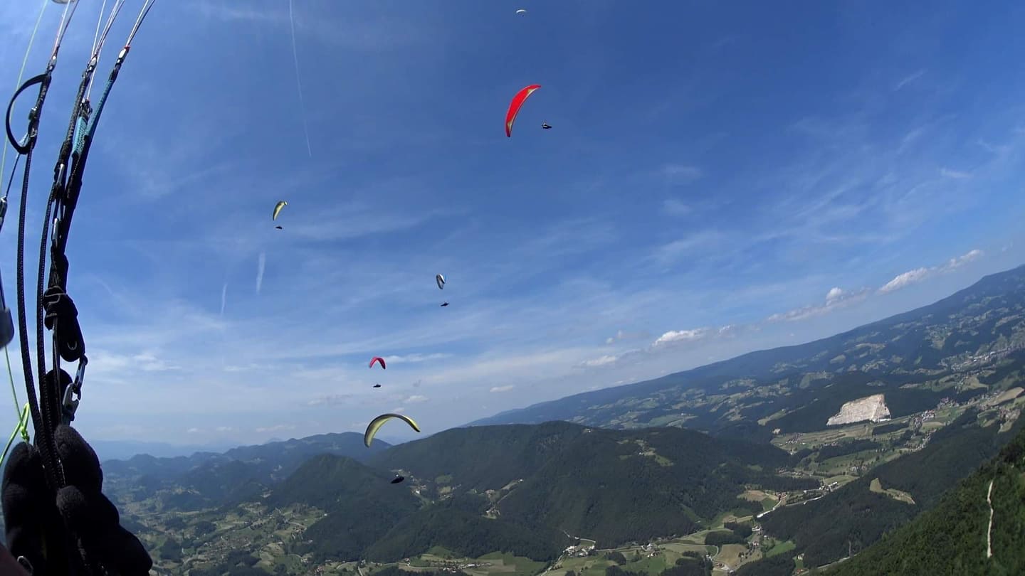 Prvi tekmovalni dan je za nami, vseh pilotov v zraku in kasneje na tleh J nas je bilo 91. Task commitee nam je za začetek sestavil nekoliko krajšo nalogo 45,8 km (optimizirana razdalja). Štartni cilinder smo imeli na vzletišču Kobala, prvo obratno točko so nam postavili v Podbelo vendar z velikim cilindrom (14km) tako, da smo imeli odprtih več različnih linij za letenje do nje, vendar smo se vsi odločili, da naberemo čim več višine nad Kobalo oziroma Kobiljo glavo in se odpravimo preko standardne linije Kobala – Vodli vrh – Mrzlegi vrh in do roba prvega cilindra ki je segal do vasi Kamno oziroma Planice pod Krnom. Ko smo leteli preko Mrzlega vrha je bilo kot vedno zelo »divje« in je bilo v nižjih višinah kar pestro z zelo močnimi stebri. Jaz sem moral kar konkretno zategovat komande in kontrolirat padalo, da mi ga ni zapiralo in se v stebru pogovarjal sam s sabo in s padalom naj bo priden J. Po prvi točki je sledil let do Mosta na Soči po pribljižno enaki liniji. Iz Mosta na Soči se odpravimo proti naslednjemu cilindru, ki se je zaključil nad vasjo Kobarid. Sam sem se odločil za linijo preko Mrzlega vrha, ki je bil siguren da dela. Spet naberem višino na njem in se odpravim do Kobarida tam popravim višino in se spolnim gasom poženem naprej proti zadnji točki, ki smo jo lahko dotaknili pri letenju v cilj, ki je bil pristanek v kampu Gabrje.